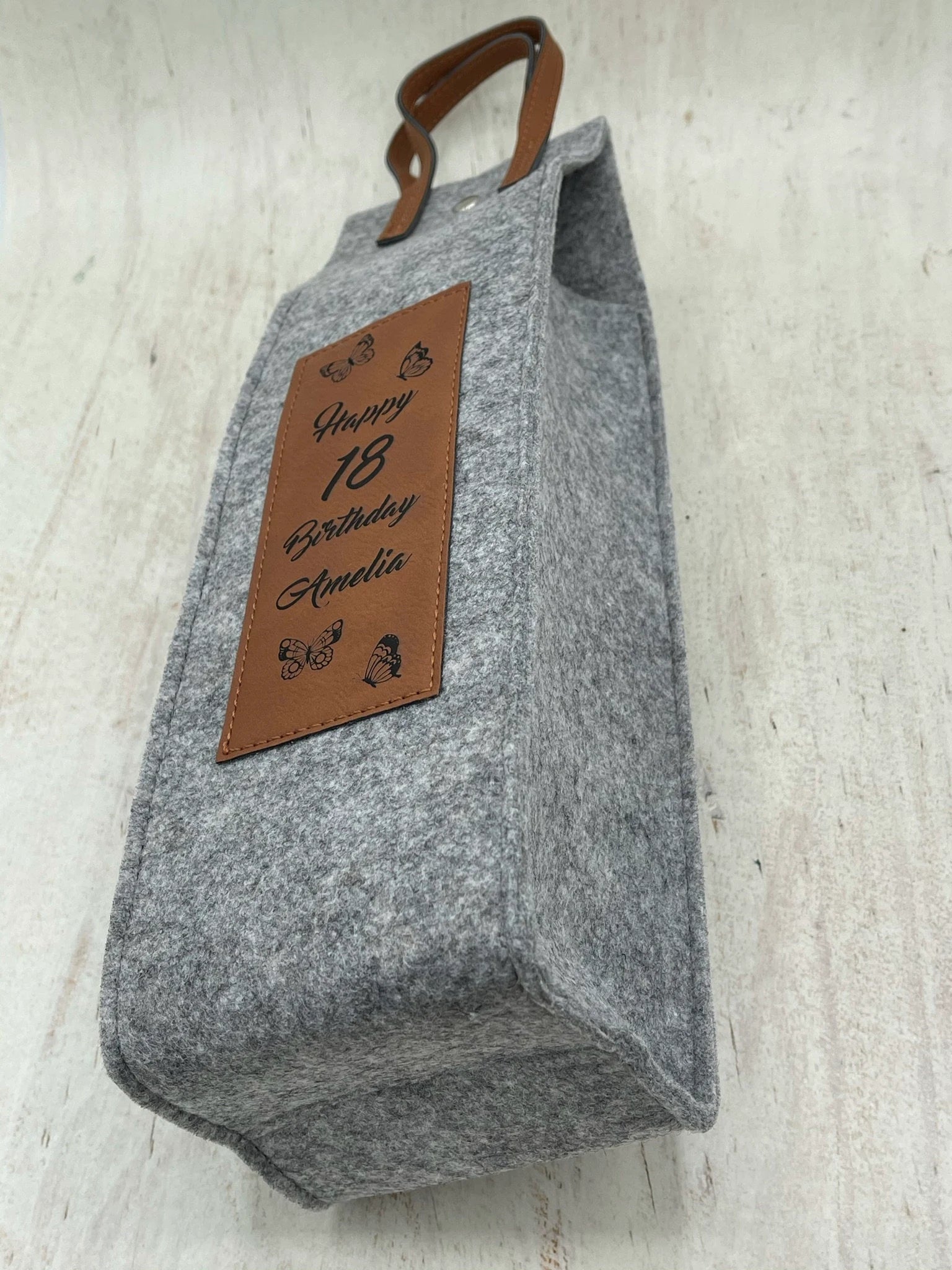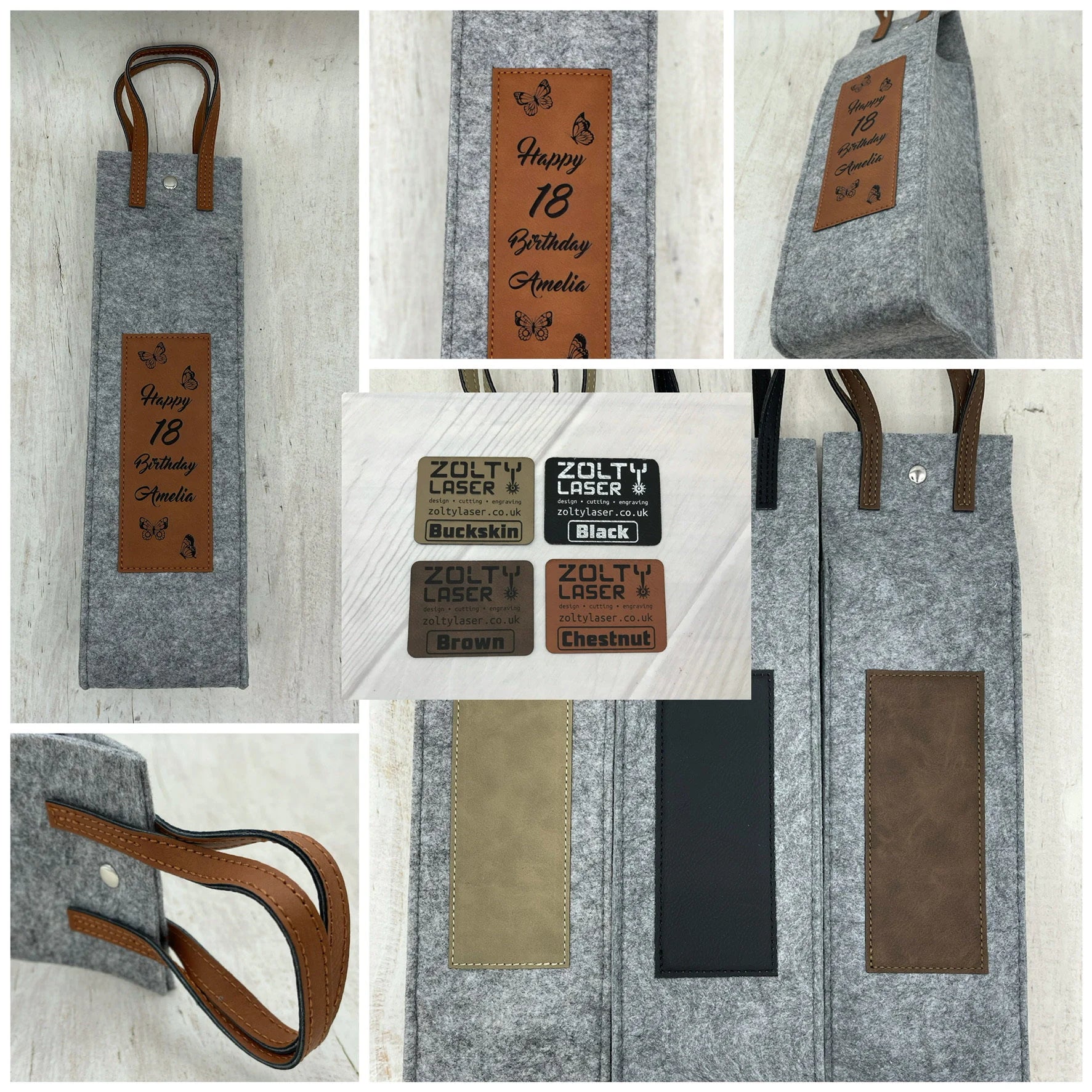 This Personalised Flannel Wine Tote is a perfect and unique way to celebrate a birthday, wedding, or anniversary. It is 100mm wide, 95mm deep, and 350mm high, and is available with four different colour faux leather designs on the front for personalisation. It is dispatched via Royal Mail 2nd Class